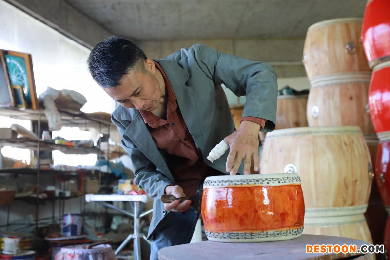 走进永新县郭氏传承制鼓厂,几名手工艺人正专注于制作鼓,锯木、抛光、箍紧、打底、上漆……经过缜密复杂的工序,一个个成品鼓就被制作出来了。永新县郭氏传承制鼓厂大师傅洪伟林说:“我在这里已经做了有差不多8年了,在这里做事方便,可以照顾小孩、父母,也可以种农田,这里比较自由,每个月工资能拿个四五千。”